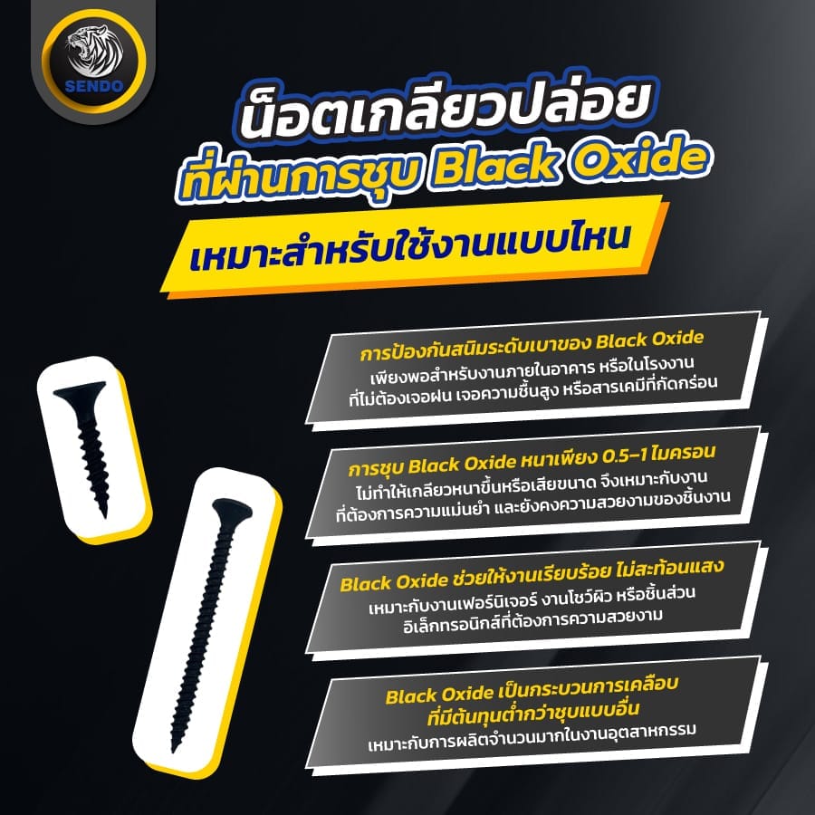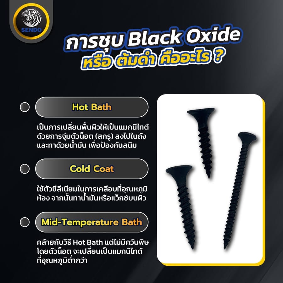 ซึ่งการเคลือบ Black Oxide มีจุดเด่นคือ ช่วยเพิ่มความทนทานต่อการสึกหรอ ลดแรงเสียดทาน และเสริมความสวยงามให้กับน็อต (สกรู) โดยทั่วไปจะใช้ในงานที่ต้องการความเรียบร้อย แข็งแรง และไม่สะท้อนแสง เหมาะกับงานที่ไม่เจอความชื้น หรือสภาพแวดล้อมรุนแรงมากนัก แต่ยังต้องการความทนทาน และความสวยงามควบคู่กันไป