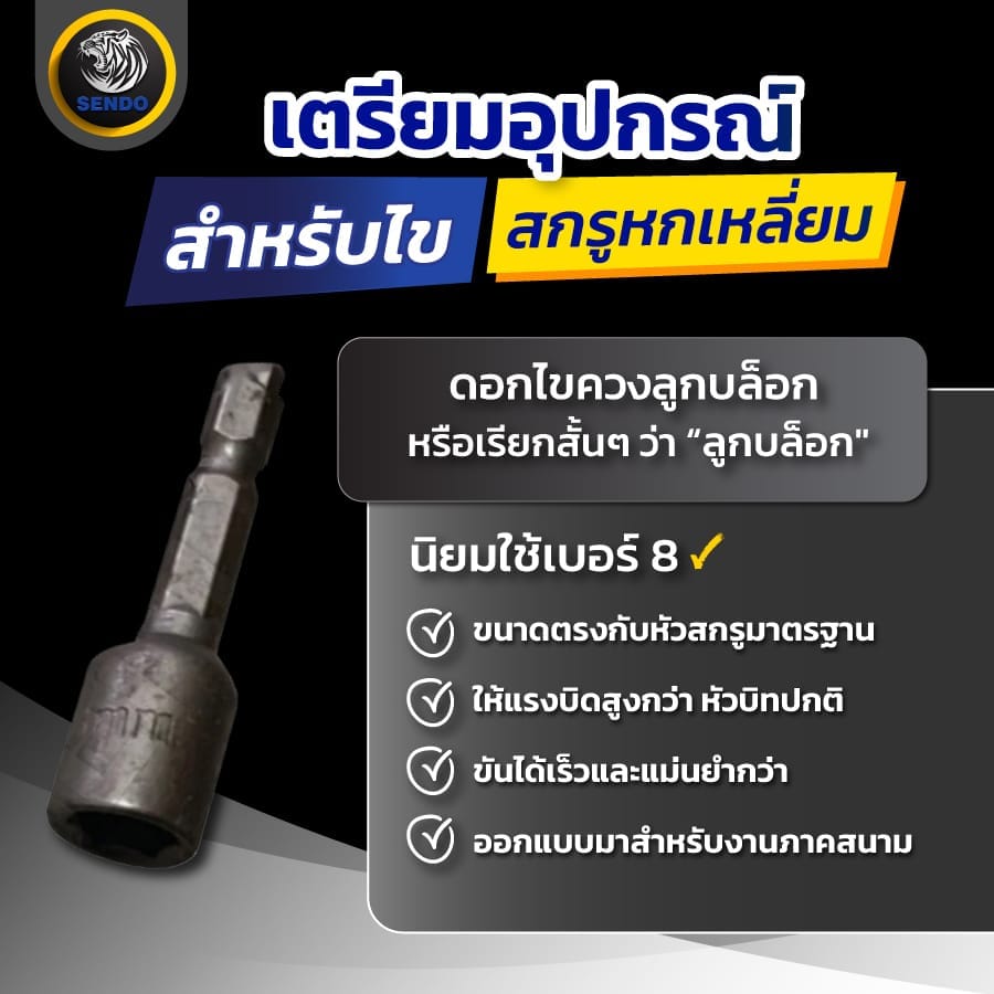 อุปกรณ์ที่เหมาะสำหรับการไข สกรู (น็อต) หกเหลี่ยม โดยเฉพาะในงานติดตั้งหลังคาเมทัลชีท คือ ดอกไขควงลูกบล็อก หรือเรียกสั้นๆ ว่า “ลูกบล็อก” เบอร์ 8 กับ เบอร์ 10 แต่ เบอร์ 8 จะเป็นเบอร์ที่ช่างนิยมใช้กว่า 90% ซึ่งเหตุผลที่ ดอกไขควงลูกบล็อก เบอร์ 8 เหมาะกับ สกรูหัวหกเหลี่ยม มีดังนี้